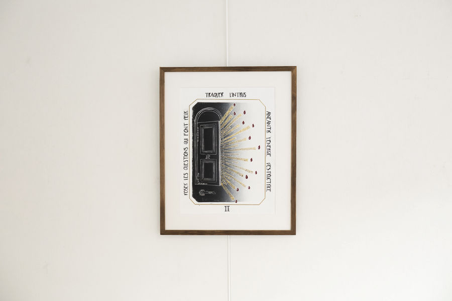 Linogravure, encre, acrylique, feuille miroir doré, papier 180g, 2021